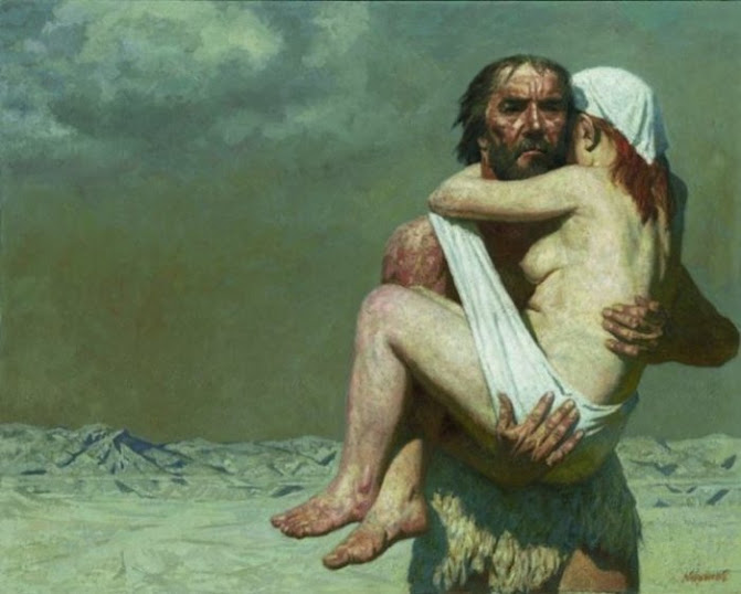 Τό "Deprived of Paradise" (1998) εἶναι ἕνας ἀπό τούς πιό δυνατούς συναισθηματικά πίνακες τοῦ Geliy Korzhev. Τό "Deprived of Paradise" εἶναι γεμᾶτο μέ ἔντονα συναισθήματα: ὁ Ἀδάμ κρατᾶ τήν Εὔα στήν ἀγκαλιά του σάν νά ἦταν τό πιό πολύτιμο πρᾶγμα στή Γῆ. Ὁ Korzhev φέρνει τήν δραματική ἐκδίωξη τοῦ Ἀδάμ καί τῆς Εὔας ἀπό τόν παράδεισο σέ ἕναν κόσμο συναισθημάτων καί ἐμπειριῶν πιό κατανοητῶν στόν σύγχρονο θεατή. Ό ἥρωας κουβαλᾶ τήν ἡρωίδα στήν ἀγκαλιά του σέ μιά ξεραμένη, ραγισμένη, σάν πεδίο μάχης γῆ. Οἱ δύο χαρακτῆρες χωρίζονται ἀπό τό τοπίο στό βάθος μέ μιά τεράστια ἀπόσταση. Τίποτα δέν τούς συνδέει μέ αὐτό. Ἡ σύνθεση τοῦ πίνακα ἀπηχεῖ τόν τίτλο τοῦ σχεδόν κυριολεκτικά ὁ παράδεισος χάθηκε, ἡ εὐημερία καί ἡ εὐτυχία πού ἔφερε ἔχουν χαθεῖ. Τό μέλλον εἶναι γεμᾶτο ἀβεβαιότητα καί ἀδιάκοπες δοκιμασίες ζωῆς. Κοιτᾶξτε τό πρόσωπο τοῦ Ἀδάμ. Δέν ὑπάρχει καμία λύπη γιά τόν χαμένο παράδεισο, ὑπάρχει μιά σταθερή ἀπόφαση γιά ἐπιβίωση καί ἐπίγνωση τῆς δύναμης κάποιου γιά τήν ἐπίτευξη τοῦ στόχου. Δέν ξέρω πῶς ὁ καλλιτέχνης κατάφερε νά ἀπεικονίσει τήν Εὔα τόσο συγκινητικά...ένα ἀνυπεράσπιστο γυναικεῖο σῶμα, καθόλου σεξουαλικό, πού ἐμπιστεύεται τόν ἑαυτό της στά χέρια τοῦ ἄντρα της. Κοιτᾶξτε τά πληγωμένα πόδια της - περπάτησε ὅσο μποροῦσε κατά μῆκος τῶν αἰχμηρων πετρῶν, μετά, προφανῶς, ἔμεινε πίσω, ἔπεσε ἐπανειλημμένα, ἴσως ἔκλαψε, ἴσως τώρα κλαίει, χωμένη στόν ὦμο τοῦ Ἀδάμ. Καί ό Ἀδάμ κουβαλάει τό ἀκριβό του φορτίο, καί θά τό κουβαλάει γιά πολύ καιρό, ἀλλά εἶναι ἕτοιμος, καί ξέρει ὅτι θά τό κουβαλήσει, καί αὐτή ξέρει, τό ξέρει... Καί θά ὑπάρχει σπίτι, καί φαγητό, καί γιοι καί κόρες. Ἔτσι εἴμαστε ὅλοι... Μέχρι τότε, ἔτσι...